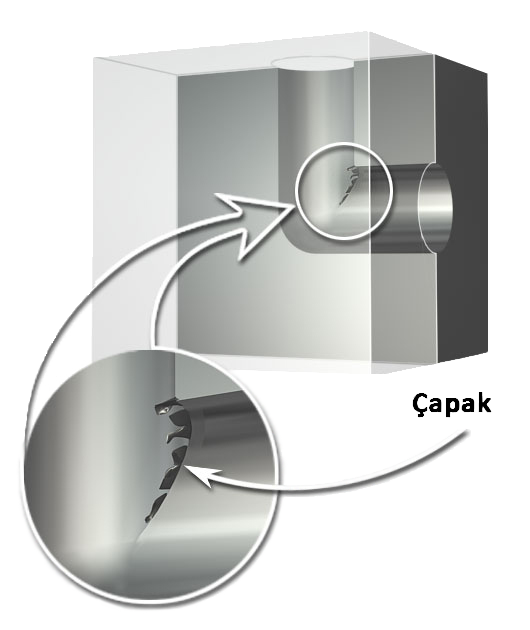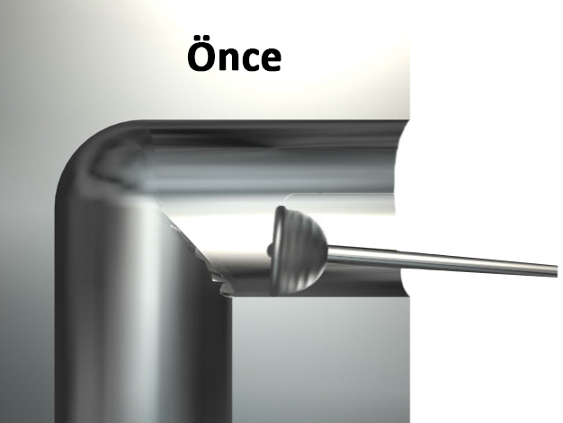 Takım kesişme noktasına ilerler, kesisi uç köşe ile buluşur ve çapak alma operasyonu başlar